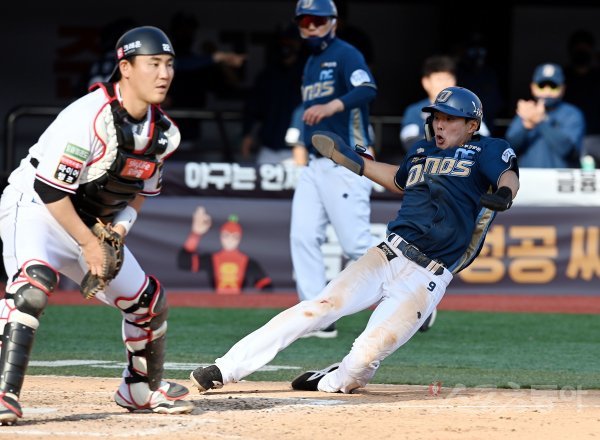 24일 경기도 수원 kt위즈파크에서 ‘2022 신한은행 SOL KBO리그’ kt 위즈와 NC 다이노스의 경기가 열렸다. 연장 10회초 2사 2루에서 NC 최승민이 적시타 때 득점을 올리고 있다.