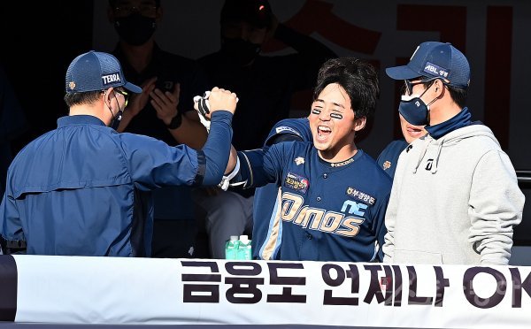 24일 경기도 수원 kt위즈파크에서 ‘2022 신한은행 SOL KBO리그’ kt 위즈와 NC 다이노스의 경기가 열렸다. 연장 10회초 2사 2루에서 NC 전민수가 1타점 적시타를 날린 후 교체되어 코치의 환영을 받고 있다.