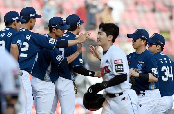 24일 경기도 수원 kt위즈파크에서 ‘2022 신한은행 SOL KBO리그’ kt 위즈와 NC 다이노스의 경기가 열렸다. NC가 연장 접전끝에 kt에 2-1 승리를 거둔 후 선수들이 그라운드에서 기쁨을 나누고 있다.
