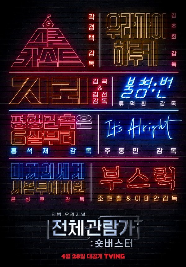 곽경택, 김초희, 윤성호, 주동민 등 스크린과 안방극장을 주름잡은 감독들이 한자리에 모인다. 28일 티빙으로 공개되는 예능 콘텐츠 ‘전체관람가+:숏버스터’(전체관람가+)가 이들의 새 무대다.콘텐츠는 8명(팀)의 감독들이 각자 단편영화를 찍는 과정을 담는다. ‘친구’의 곽경택, ‘보이스’ 김곡·김선, ‘소셜포비아’ 홍석재, ‘찬실이는 복도 많지’ 김초희, 웨이브 ‘이렇게 된 이상 청와대로 간다’ 윤성호, SBS ‘펜트하우스’ 주동민 등 감독들이 참여했다. 배우 류덕환과 조현철도 연출자로 나서서 작품을 내놓는다.