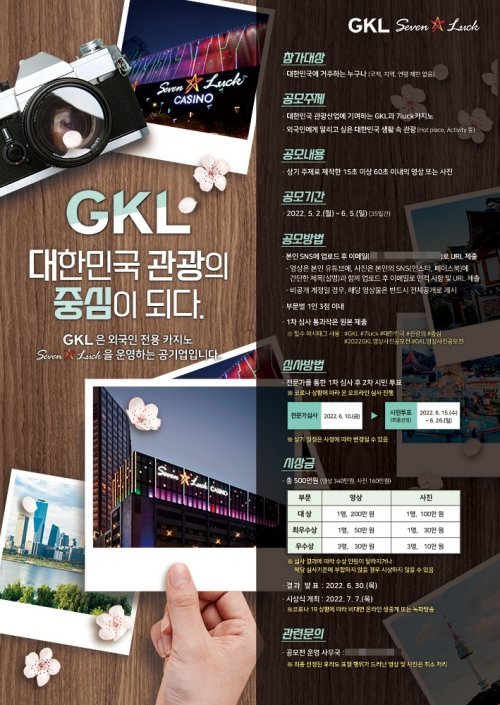 외국인 전용 카지노 세븐럭을 운영하는 게이밍 공기업 그랜드코리아레저(GKL, 사장 김영산)는 5월2일부터 6월5일까지 ‘제1회 GKL 영상·사진 공모전’을 개최한다. 대한민국 생활 속 관광 명소 및 액티비티 발굴