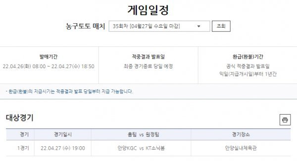 이번 농구토토 매치 35회차 게임은 27일(수) 오후 6시50분까지 구매가 가능하며, 경기가 모두 종료된 뒤 결과가 공식 발표된다.