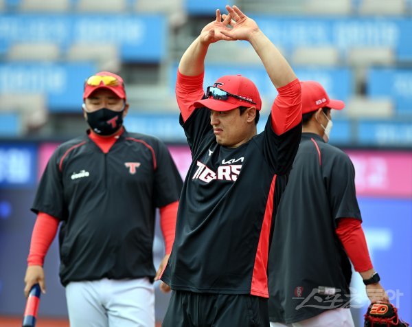 26일 경기도 수원 kt위즈파크에서 ‘2022 신한은행 SOL KBO리그’ kt 위즈와 KIA 타이거즈의 경기가 열린다. 경기에 앞서 키움에서 트레이드 된 KIA 박동원이 훈련을 펼치고 있다.
