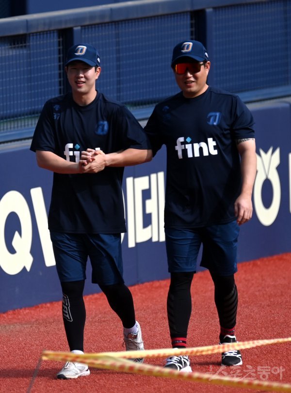 26일 서울 잠실야구장에서 ‘2022 신한은행 MY CAR KBO리그’ NC 다이노스와 두산 베어스 경기가 열린다. 경기 전 NC 박건우와 양의지가 훈련 중 이야기를 나누고 있다.