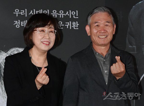 가수 박은옥, 정태춘 부부가 26일 서울 용산구 CGV용산아이파크몰점에서 열린 영화 ‘아치의 노래, 정태춘’ 언론시사회 무대인사에서 포즈를 취하고 있다.