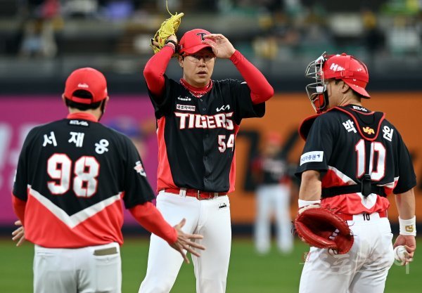 26일 경기도 수원 kt위즈파크에서 ‘2022 신한은행 SOL KBO리그’ kt 위즈와 KIA 타이거즈의 경기가 열렸다. 1회말 2사 1루에서 KIA 선발 양현종이 마운드에 오른 코치, 포수와 이야기를 나누고 있다.