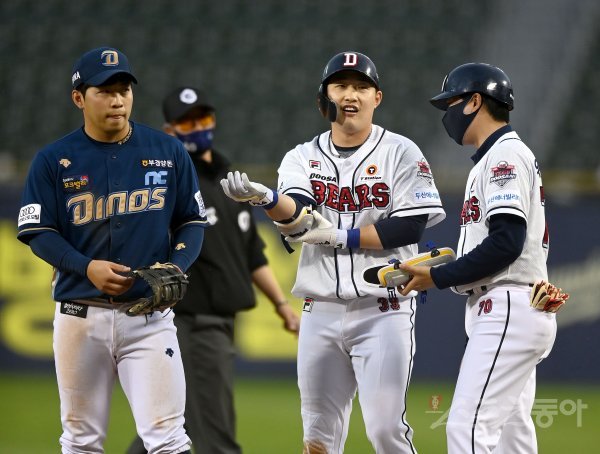 26일 서울 잠실야구장에서 ‘2022 신한은행 MY CAR KBO리그’ NC 다이노스와 두산 베어스 경기가 열렸다. 2회말 2사 2루 두산 김인태가 1타점 적시타를 치고 1루에서 기뻐하고 있다.