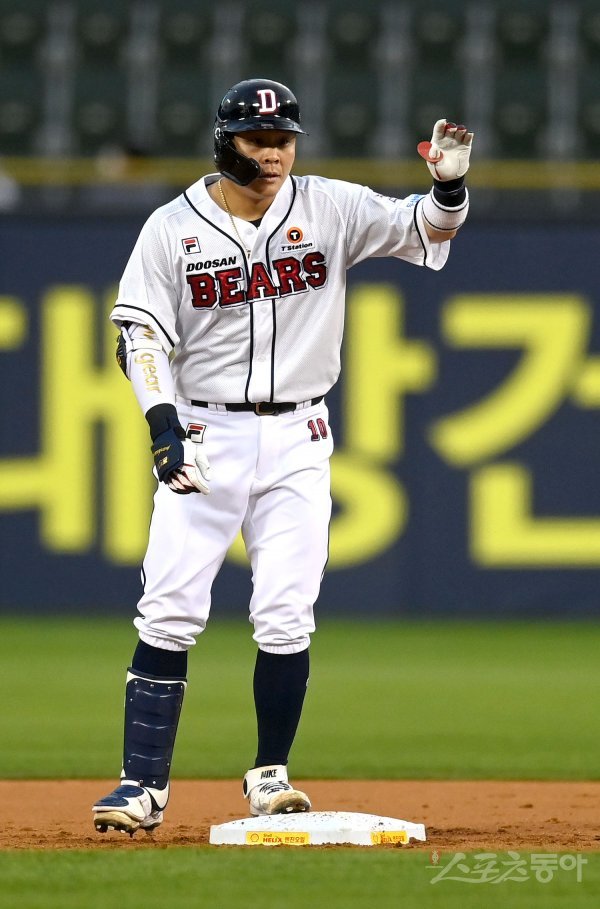 26일 서울 잠실야구장에서 ‘2022 신한은행 MY CAR KBO리그’ NC 다이노스와 두산 베어스 경기가 열렸다. 2회말 2사 2루 두산 박세혁이 선제 1타점 2루타를 치고 2루에서 기뻐하고 있다.