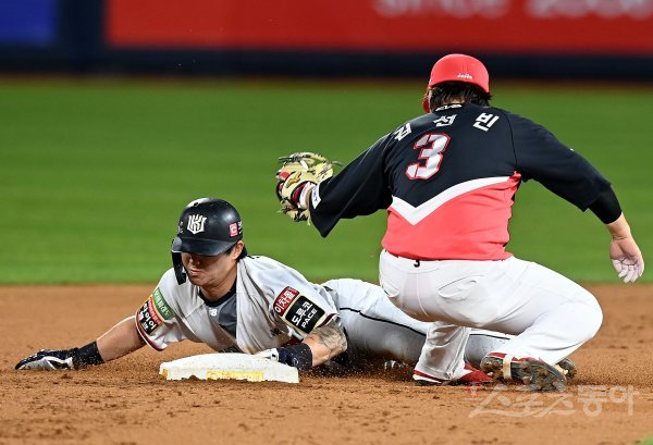 26일 경기도 수원 kt위즈파크에서 ‘2022 신한은행 SOL KBO리그’ kt 위즈와 KIA 타이거즈의 경기가 열렸다. 3회말 2사 1루에서 kt 김민혁이 2루 도루를 시도했으나 태그 아웃되고 있다.