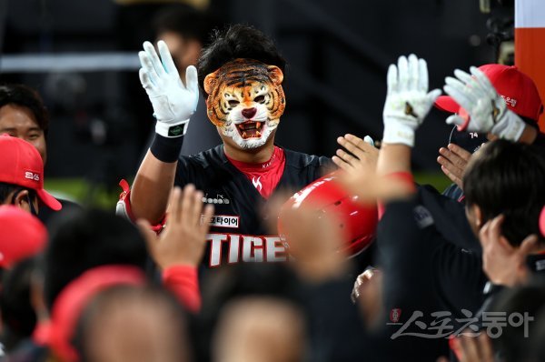 26일 경기도 수원 kt위즈파크에서 ‘2022 신한은행 SOL KBO리그’ kt 위즈와 KIA 타이거즈의 경기가 열렸다. 7회초 무사에서 KIA 김석환이 솔로 홈런을 쏘아 올린 후 호랑이 마스크를 쓴채 동료들의 환영을 받고 있다.
