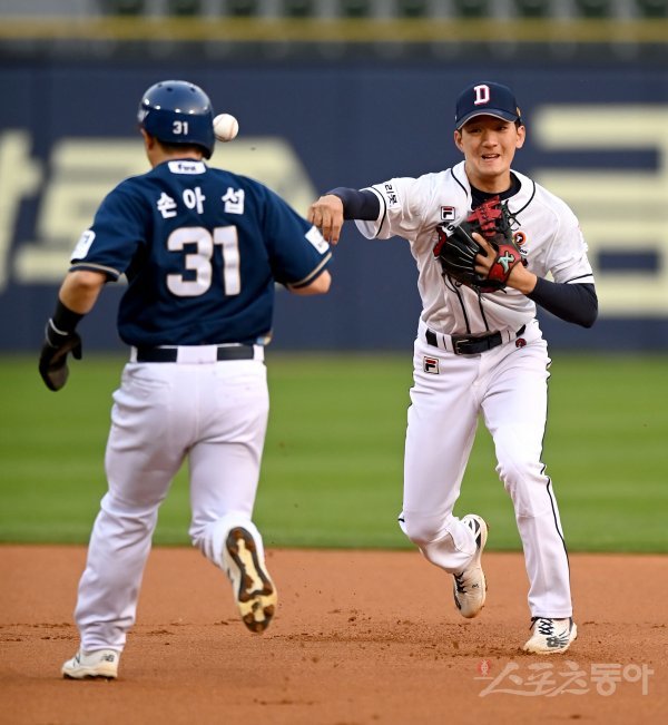 26일 서울 잠실야구장에서 ‘2022 신한은행 MY CAR KBO리그’ NC 다이노스와 두산 베어스 경기가 열렸다. 1회초 1사 1루 NC 내야 땅볼 때 두산 안재석이 1루주자를 포스 아웃시킨 후 1루로 송구하고 있다.
