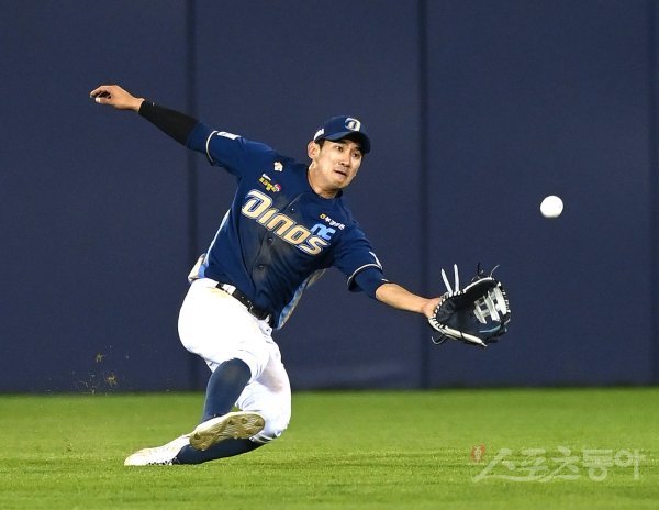 26일 서울 잠실야구장에서 ‘2022 신한은행 MY CAR KBO리그’ NC 다이노스와 두산 베어스 경기가 열렸다. 7회말 무사 NC 김기환이 외야 뜬공을 다이빙캐치하고 있다.