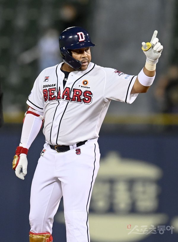 26일 서울 잠실야구장에서 ‘2022 신한은행 MY CAR KBO리그’ NC 다이노스와 두산 베어스 경기가 열렸다. 6회말 1사 1,2루 두산 페르난데스가 2타점 중전 2루타를 치고 2루에서 기뻐하고 있다.