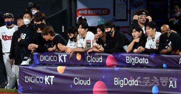 26일 경기도 수원 kt위즈파크에서 ‘2022 신한은행 SOL KBO리그’ kt 위즈와 KIA 타이거즈의 경기가 열렸다. 5-10으로 뒤진 kt의 9회말 마지막 공격 때 선수들이 경기를 지켜보고 있다.