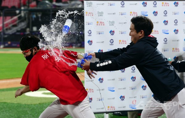26일 경기도 수원 kt위즈파크에서 ‘2022 신한은행 SOL KBO리그’ kt 위즈와 KIA 타이거즈의 경기가 열렸다. KIA가 kt를 상대로 10-5로 승리한 뒤 승리투수 양현종이 인터뷰 후 동료들의 물세례를 받고 있다.