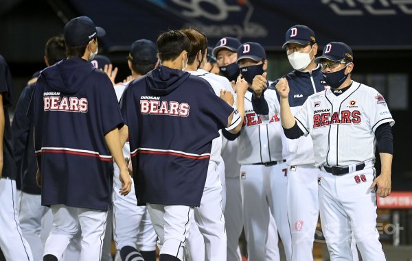 26일 서울 잠실야구장에서 ‘2022 신한은행 MY CAR KBO리그’ NC 다이노스와 두산 베어스 경기가 열렸다. 8-4 승리를 거둔 후 두산 김태형 감독이 선수들과 하이파이브 하고 있다. 잠실 | 김종원 기자 won@donga.com
