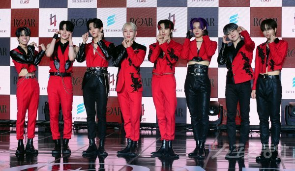 엘라스트(E‘LAST) 미니 3집 ‘로어’(ROAR) 쇼케이스가 27일 오후 서울 청담동 일지아트홀에서 열렸다. 엘라스트 최인(왼쪽부터), 승엽, 백결, 라노, 로민, 원혁, 원준, 예준이 카메라를 향해 포즈를 취하고 있다.