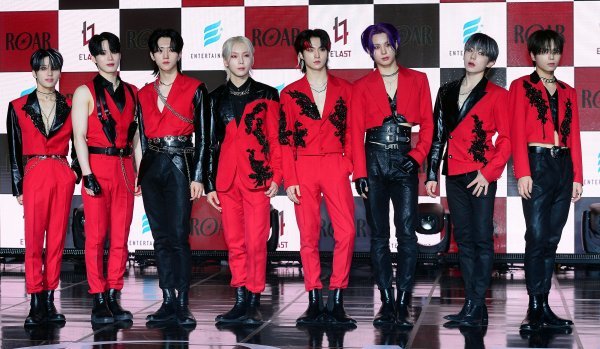 엘라스트(E‘LAST) 미니 3집 ‘로어’(ROAR) 쇼케이스가 27일 오후 서울 청담동 일지아트홀에서 열렸다. 엘라스트 최인(왼쪽부터), 승엽, 백결, 라노, 로민, 원혁, 원준, 예준이 카메라를 향해 포즈를 취하고 있다.