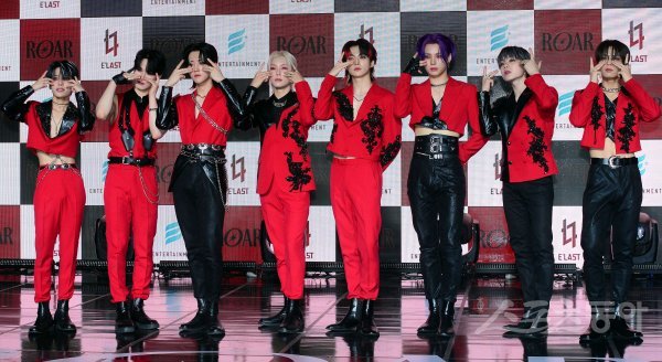 엘라스트(E‘LAST) 미니 3집 ‘로어’(ROAR) 쇼케이스가 27일 오후 서울 청담동 일지아트홀에서 열렸다. 엘라스트 최인(왼쪽부터), 승엽, 백결, 라노, 로민, 원혁, 원준, 예준이 카메라를 향해 포즈를 취하고 있다.