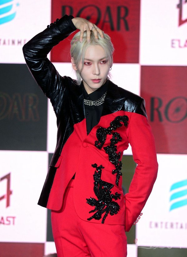 엘라스트(E‘LAST) 미니 3집 ‘로어’(ROAR) 쇼케이스가 27일 오후 서울 청담동 일지아트홀에서 열렸다. 엘라스트 라노가 카메라를 향해 포즈를 취하고 있다.