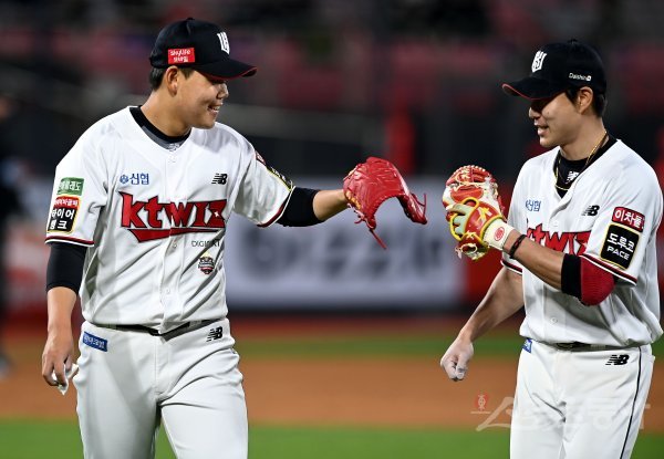 27일 경기도 수원 kt위즈파크에서 ‘2022 신한은행 SOL KBO리그’ kt 위즈와 KIA 타이거즈의 경기가 열렸다. 4회초 KIA 공격을 삼자범퇴로 막은 kt 선발 소형준이 이닝 종료 후 더그아웃으로 향하며 심우준과 이야기를 나누고 있다.