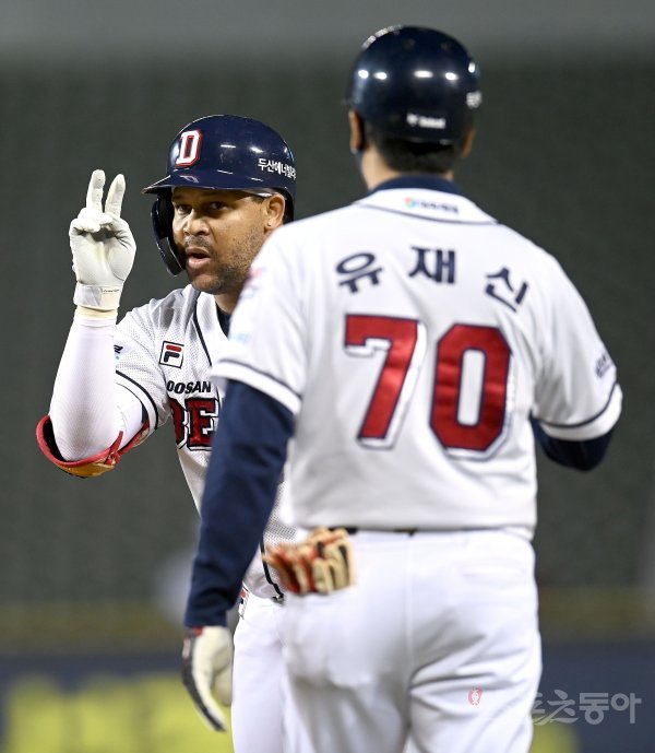 27일 서울 잠실야구장에서 ‘2022 신한은행 MY CAR KBO리그’ NC 다이노스와 두산 베어스 경기가 열렸다. 5회말 2사 2루 두산 페르난데스가 1타점 적시타를 치고 1루에서 기뻐하고 있다.