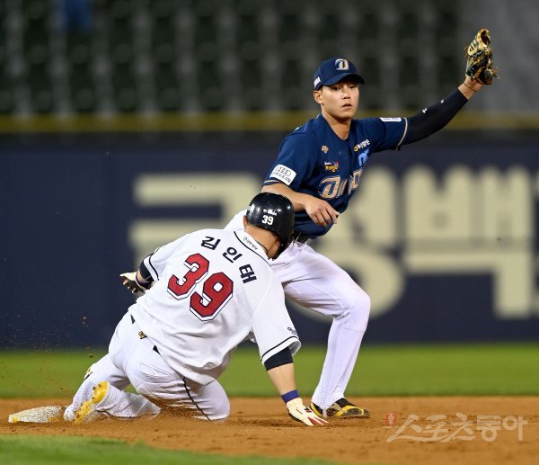 27일 서울 잠실야구장에서 ‘2022 신한은행 MY CAR KBO리그’ NC 다이노스와 두산 베어스 경기가 열렸다. 5회말 1사 1루 두산 내야 땅볼 때 1루주자 김인태가 2루에서 포스 아웃되고 있다.