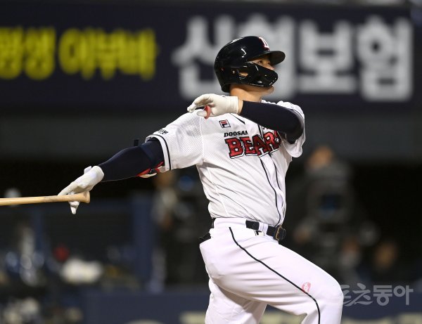 27일 서울 잠실야구장에서 ‘2022 신한은행 MY CAR KBO리그’ NC 다이노스와 두산 베어스 경기가 열렸다. 3회말 2사 2,3루 두산 김재환이 다시 앞서가는 우월 스리런 홈런을 날리고 있다.