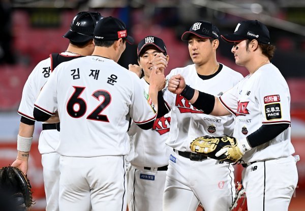 27일 경기도 수원 kt위즈파크에서 ‘2022 신한은행 SOL KBO리그’ kt 위즈와 KIA 타이거즈의 경기가 열렸다. kt가 KIA를 상대로 3-1로 승리한 뒤 선수들이 그라운드에서 기쁨을 나누고 있다.