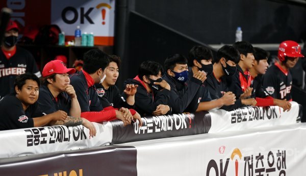 27일 경기도 수원 kt위즈파크에서 ‘2022 신한은행 SOL KBO리그’ kt 위즈와 KIA 타이거즈의 경기가 열렸다. kt에 1-3으로 뒤진 KIA의 9회초 마지막 공격 때 선수들이 경기를 지켜보고 있다.