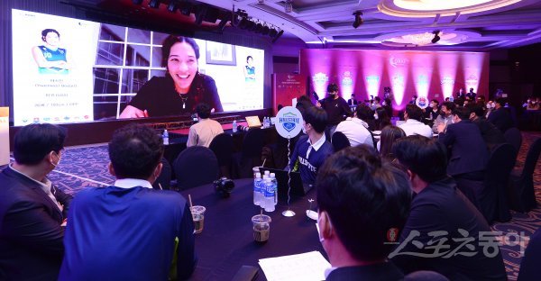 28일 서울 강남구 청담 리베라 호텔에서 열린 2022 KOVO 여자부 외국인선수 드래프트에서 현대건설과 재계약한 야스민이 화상 통화를 하고 있다.