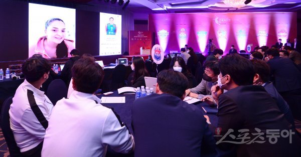 28일 서울 강남구 청담 리베라 호텔에서 열린 2022 KOVO 여자부 외국인선수 드래프트에서 5순위로 한국도로공사에 지명된 카타리나 요비치가 화상 통화를 하고 있다.