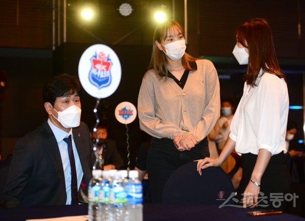 28일 서울 강남구 청담 리베라 호텔에서 열린 2022 KOVO 여자부 외국인선수 드래프트에서 김종민 한국도로공사 감독과 한유미 해설위원이 이야기를 나누고 있다.