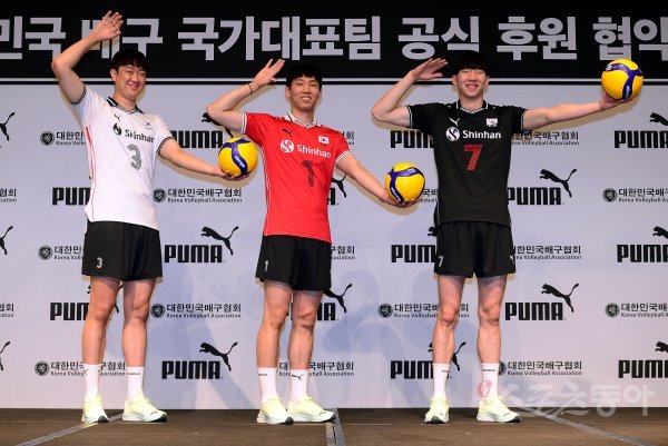 28일 서울 용산구 서울드래곤시티 호텔에서 푸마코리아의 배구 국가대표 공식 후원사 협약 및 신규 유니폼 공개 행사가 열렸다. 배구국가대표팀 나경복(왼쪽부터), 황택의, 허수봉이 카메라를 향해 포즈를 취하고 있다.
