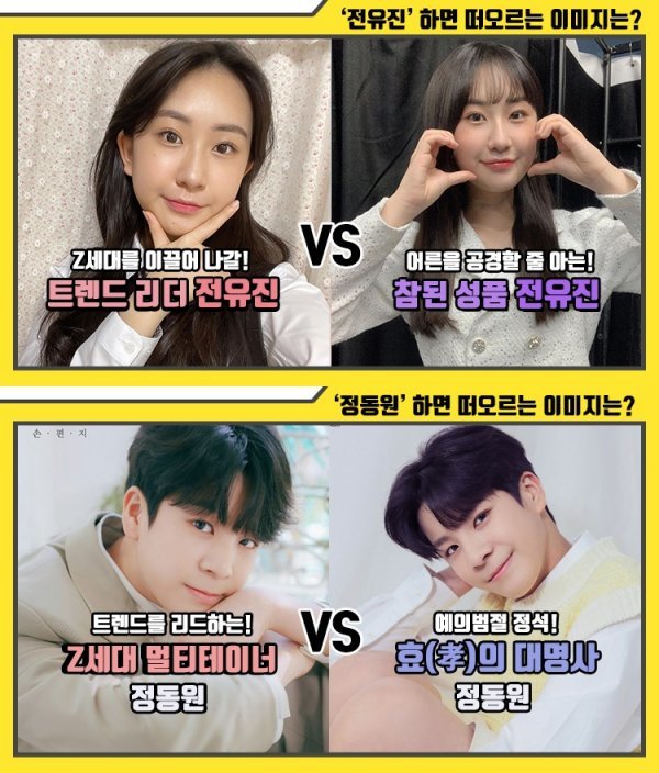 먼저 전유진은 ‘Z세대를 이끌어 갈! 트렌드 리더’와 ‘어른을 공경할 줄 아는! 참된 성품’ 컨셉으로 경합을 벌이고 있다. 정동원은 ‘트렌드를 리드하는! Z세대 멀티테이너’와 ‘예의범절 정석! 효(孝)의 대명사’ 컨셉이 배틀 중이다.