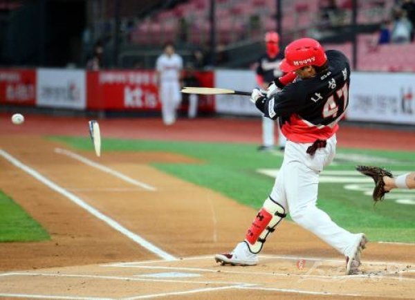 28일 수원KT위즈파크에서 ‘2022 신한은행 MY CAR KBO리그’ KIA 타이거즈와 KT 위즈 경기가 열렸다. 1회초 2사 KIA 나성범이 배트가 부러지는 가운데 안타를 치고 있다.