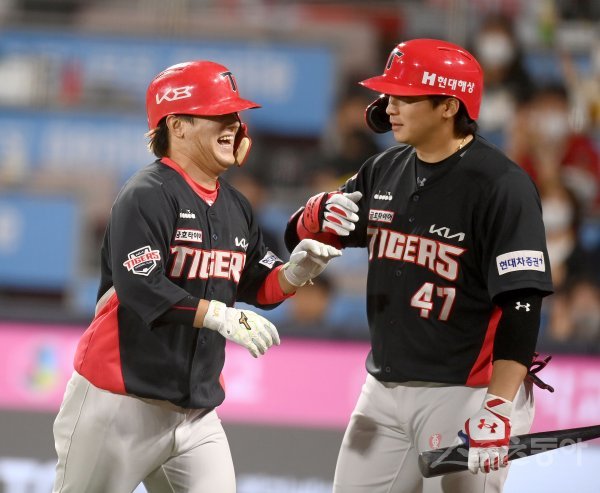 28일 수원KT위즈파크에서 ‘2022 신한은행 MY CAR KBO리그’ KIA 타이거즈와 KT 위즈 경기가 열렸다. 6회초 무사 KIA 김선빈이 좌월 솔로 홈런을 날리고 그라운들 돌아 홈인해 나성범의 축하를 받고 있다.