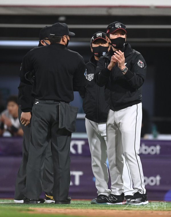 28일 수원KT위즈파크에서 ‘2022 신한은행 MY CAR KBO리그’ KIA 타이거즈와 KT 위즈 경기가 열렸다. 5회말 1사 1루 KT 심우준 삼진 아웃되는 사이 1루주자 가 도루한 것이 무효로 간주되자 KT 이강철 감독이 항의하고 있다.