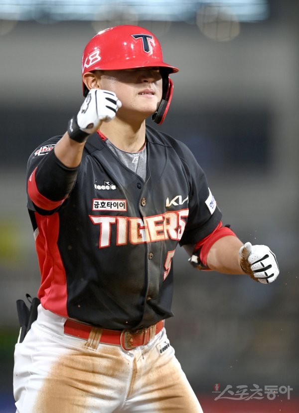 28일 수원KT위즈파크에서 ‘2022 신한은행 MY CAR KBO리그’ KIA 타이거즈와 KT 위즈 경기가 열렸다. 5회초 2사 2루 KIA 김도영이 1타점 좌전 3루타를 치고 3루에서 주먹을 쥐고 있다.