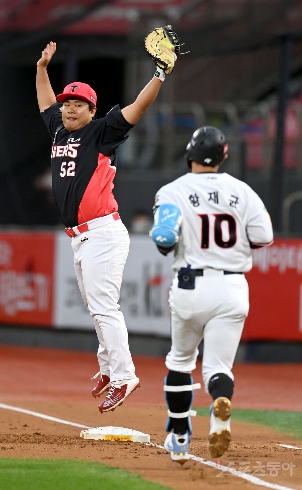 28일 수원KT위즈파크에서 ‘2022 신한은행 MY CAR KBO리그’ KIA 타이거즈와 KT 위즈 경기가 열렸다. 1회말 1사 KT 내야 땅볼 때 KIA 황대인이 송구된 볼을 잡아 타자주자를 아웃시키고 있다.