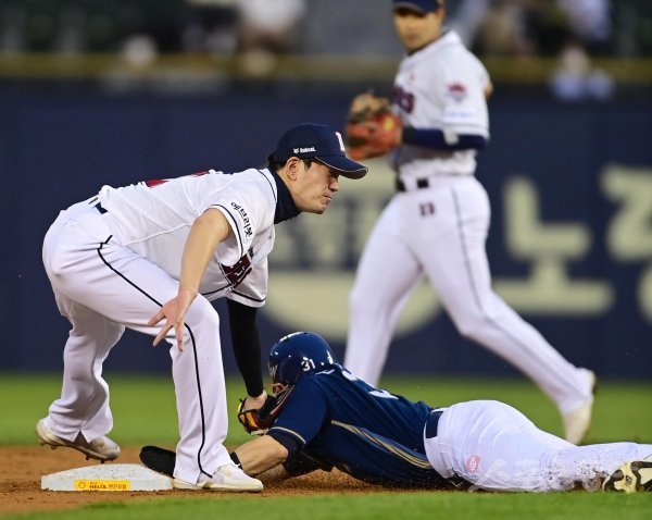 28일 서울 잠실야구장에서 열린 ‘2022 신한은행 SOL KBO리그’ 두산 베어스와 NC 다이노스의 경기에서 2회초 2사 1루 상황에서 두산 김재호가 도루를 시도한 NC 1루주자를 태그 아웃시키고 있다.