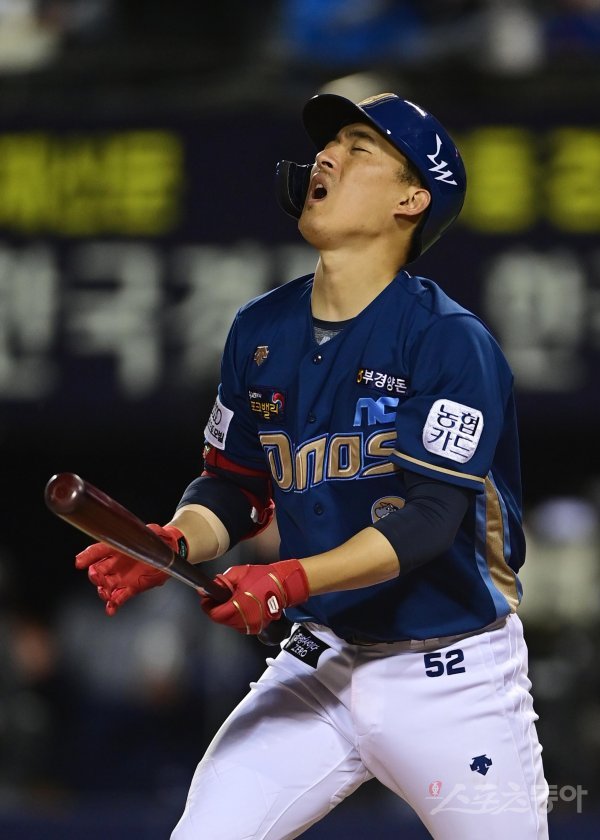 28일 서울 잠실야구장에서 열린 ‘2022 신한은행 SOL KBO리그’ 두산 베어스와 NC 다이노스의 경기에서 4회초 2사 1, 3루 NC 노진혁이 헛스윙 삼진 아웃을 당하며 아쉬워하고 있다.
