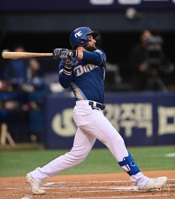 28일 서울 잠실야구장에서 열린 ‘2022 신한은행 SOL KBO리그’ 두산 베어스와 NC 다이노스의 경기에서 1회초 1사 만루 NC 마티니가 2타점 중전 적시타를 치고 있다.