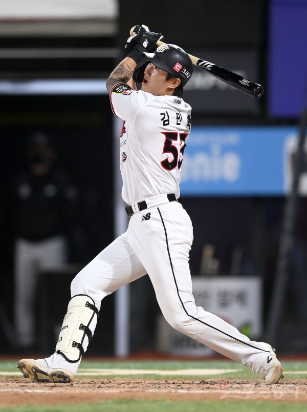 28일 수원KT위즈파크에서 ‘2022 신한은행 MY CAR KBO리그’ KIA 타이거즈와 KT 위즈 경기가 열렸다. 7회말 2사 2루 KT 김민혁이 다시 앞서가는 1타점 중전 2루타를 치고 있다.