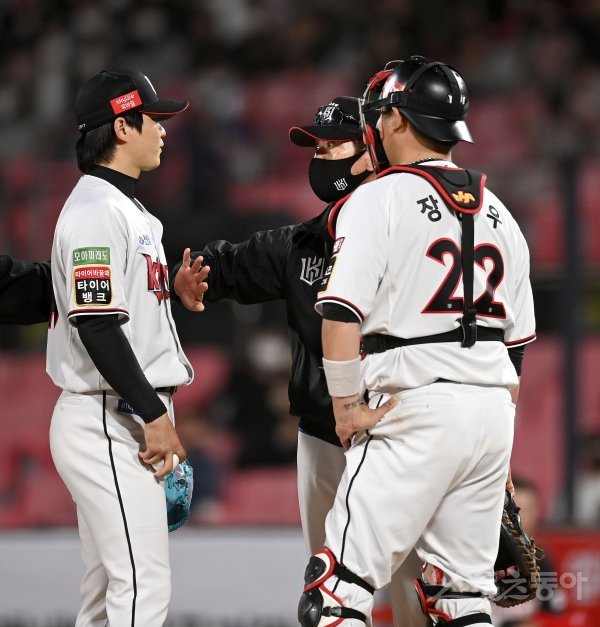 28일 수원KT위즈파크에서 ‘2022 신한은행 MY CAR KBO리그’ KIA 타이거즈와 KT 위즈 경기가 열렸다. 8회초 2사 만루 상황에서 KT 이강철 감독이 마운드에 올라 박시영과 이야기하고 있다.