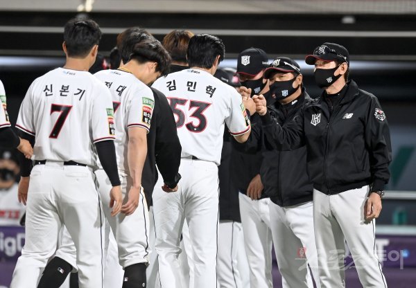 28일 수원KT위즈파크에서 ‘2022 신한은행 MY CAR KBO리그’ KIA 타이거즈와 KT 위즈 경기가 열렸다. 5-3 승리를 거두며 2연승을 달린 KT 이강철 감독이 선수들이 기뻐하고 있다.