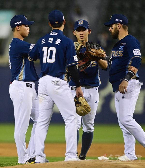 28일 서울 잠실야구장에서 열린 ‘2022 신한은행 SOL KBO리그’ 두산 베어스와 NC 다이노스의 경기에서 두산에 9-5로 승리한 NC 박준영, 서호철, 마티니가 기쁨을 나누고 있다.