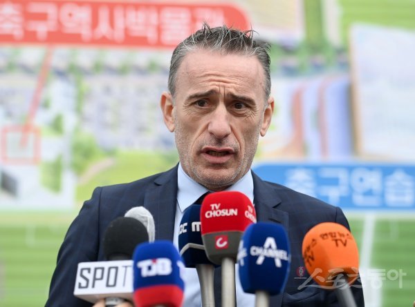 29일 충남 천안에서 열린 대한민국 축구종합센터 착공식에서 벤투 감독이 인터뷰를 하고 있다.