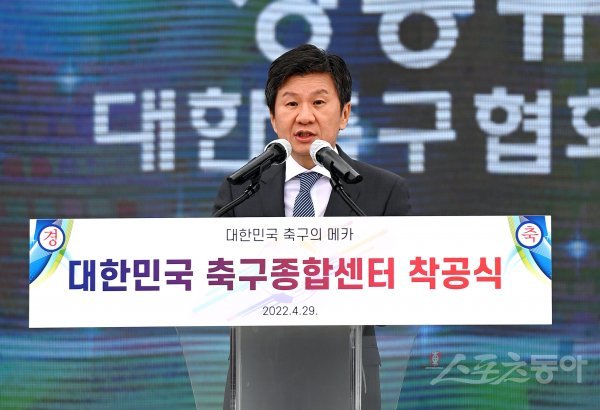 29일 충남 천안에서 열린 대한민국 축구종합센터 착공식에서 대한축구협회 정몽규 회장이 격려사를 하고 있다.