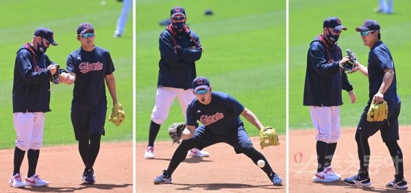 1일 서울 잠실야구장에서 열린 ‘2022 신한은행 SOL KBO리그’ LG 트윈스와 롯데 자이언츠의 경기에 앞서 롯데 서튼 감독이 수비 훈련 도중 실수한 김민수에게 글러브를 전해주고 있다.